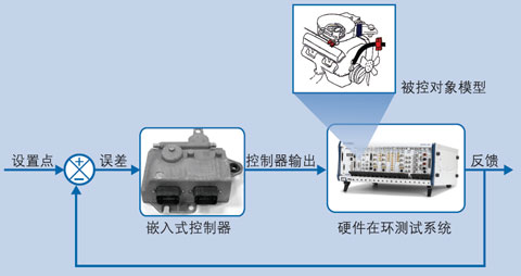 当测试系统的一部分运行在实时系统上时,就是我们所说的实时测试。实时测试提高了测试的稳定性和可靠性。一个典型的实时测试是硬件在环(HIL)测试,例如将受控对象的模型运行在实时系统上,从而对控制器产品或原型进行测试(图2)。再比如,在半导体协议感知测试中,协议感知接口也往往要基于实时系统实现。