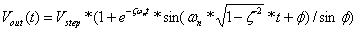 图 1 显示了带开关输入的简化滤波器示意图。电路的电感可以为有意的也可以是偶然发生的,例如:以太网供电 (PoE) 系统的长通电线路。该图还显示了步进的输入电压波形,以及阻尼系数小于 1 时的生成输出电压。(大于 1 的阻尼系数没有过冲。)更低阻尼系数的响应形式如下:
