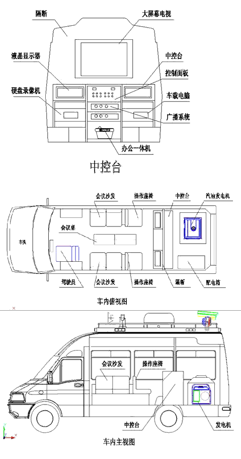 指挥车是以南京依维柯17座普通型客车底盘作为改装平台,保证工作人员拥有宽敞舒适的工作环境,并且为系统的运行和维护提供符合技术要求的环境条件。在保证整车性能的前提下对车辆进行改装,实现符合设备技术要求的工作环境,这是改装设计的重点。