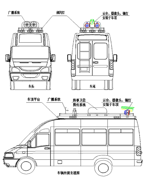 根据安全生产应急指挥中心初步设计要求和相关的设计标准,应急通信指挥车必须具备较强的通信功能和现场监控能力。此车具备高度的机动性、独立性和可靠性。因此,车辆的改装和系统总成的设计,必须达到以下要求: