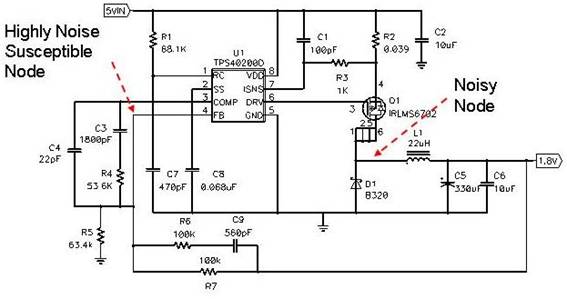 较严重的寄生电容问题通常会涉及反馈 (FB) 电压以及误差放大器补偿节点的布局。这是由于误差放大器输入的高阻抗、误差放大器的高增益,以及大量连接至该节点的组件。图 1 显示了典型控制器中出现这一问题的位置,以及一个较为可能的耦合节点。Q1 和 D1 之间的连接约有 0.1 V/ns 到 1 V/ns 的极高转换速率,并且会形成仅 1 pF 寄生电容的 1 mA 电流。