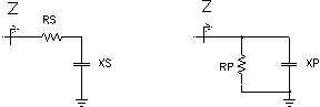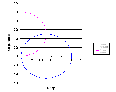 此处共有 2 个圆:一个代表恒定并联电阻,另一个代表恒定电抗。恒定电阻线在 X 轴附近对称。电抗在开路附近时,阻抗等于并联电阻。由于电抗降低,曲线路径沿圆圈至起点,其在电感分量时为正,而在电容分量时为负。由于电抗降低,曲线趋向于零。在 1/2 并联电阻距离处,圆以 X 轴为中心,其半径相同。