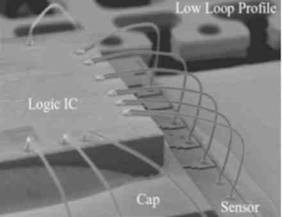 图 5:在采用注塑封装方法前利用丝焊方法把半导体芯片与下面的MEMS传感器裸片连接在一起的堆叠结构的SEM图像。