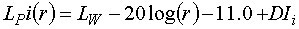 其中LPi是第i个麦克风处的声压等级,LW是声音功率级别,r是从声源到接收点以米为单位的距离,DIi是声源在第i个麦克风方向的直接索引。