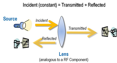 这就好比光源发出的光射向某种光学器件,例如透镜。其中,透镜就类似于一个电子网络。根据透镜的属性,一部分光将反射回光源,而另一部分光被传输过去。根据能量守恒定律,被反射的信号和传输信号的能量总和等于原信号或入射信号的能量。在这个例子中,由于热量产生的损耗通常是微不足道的,所以忽略不计。