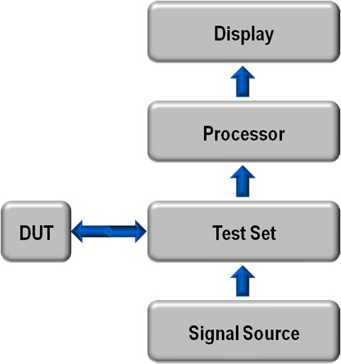 电子网络的测量方式与测量光器件的方式类似。网络分析仪产生一个正弦信号,通常是一个扫频信号。DUT响应时,会传输并且反射入射信号。传输和反射信号的强度通常随着入射信号的频率发生变化。