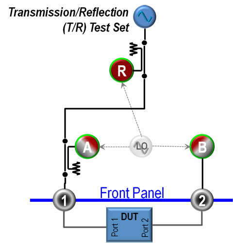 网络分析仪的基本结构绝大部分在测试装置中实现。一旦分析仪测量出入射信号(R参考接收器)和传输信号的幅值和相位,或者是反射信号(A和B接收器)的幅值和相位,就可