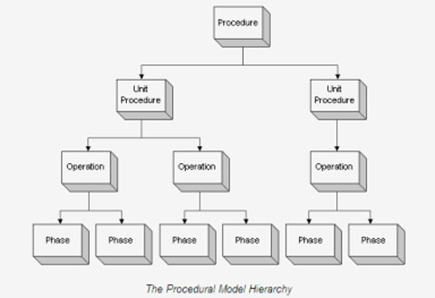 在Proficy Batch Execution系统中,采用S88标准定义的、功能强大的“程序型配方”,采用SFC(顺序功能图)进行层次化结构设计,由高到低依次为:Procedure、Unit Procedure、Operations和Phase。它不仅具有“参数型配方”的功能,而且还可以根据订单需求来组织管理设备、原料、工艺流程,生产出不同的产品。不但可以满足高度柔性的要求,提高设备的利用率和生产效率,而且能减少新品的面市时间,保证产品质量的一致性,降低维护成本。下图所示为配方设计所定义的程序模型: