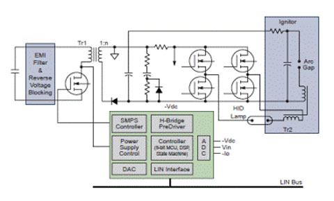 安森美半导体的全功能高强度放电(HID)(或氙灯)专用集成电路有助于改善前灯系统的性能。相对于传统的卤素灯,HID改善了显色性,降低了功耗,使用寿命更长,光输出更高。为了支持其先进的功能,需要高效率的HID大灯镇流器和复杂的控制电路。安森美半导体的HID灯控制系统是采用8位微控制器或专用状态机的混合模拟/数字解决方案,它集成了DC-DC控制器,具备全面的诊断功能(过压、欠压、温度传感器、续航时间计数器)、各种通信接口(LIN、SPI),支持35 W(D1/D2/D3/D4)和25 W(D5)灯。图3为该专用集成电路的框图。