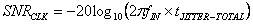 方程式 1 让您能够计算出特定 ADC 的要求时钟抖动估计值。例如,一个 70 dB SNR 的 ADC,输入信号为 100 MHz,您可以计算得到 tJITTER_TOTAL 的值为 503 微微秒。如果输入 ADC 孔径抖动为 150 微微秒,则由方程式 2 可得到一个较高的外部时钟抖动要求估计值。
