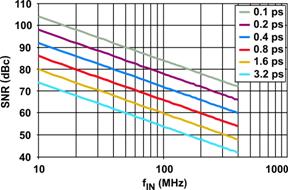 在该方程式中,fIN 为转换器的输入信号频率。另外,tJITTER-TOTAL 为时钟信号和ADC时钟输入电路的 rms 抖动。请注意,fIN 并非时钟频率 (fCLK)。外部时钟器件到 ADC 的 1 微微秒抖动适合于一些而不是所有高速 ADC 应用,如图 1 所示。