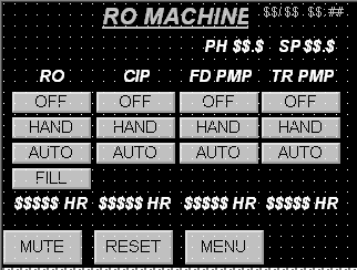 考虑到整个反渗透控制系统所需的输入输出点的个数、控制程序的编排及PLC程序存储器的容量,选用一个具有40路数字量输入、24路继电器输出和4个高速计数器的模块,还有一个4个模拟量输入,2个模拟量输出的模拟量模块。此系统采用了GE的QUICK PANEL 60触摸屏作为显示、交互设备,它通过专用电缆与PLC主机模块相连,主要用于参数设置、警报显示、工作状态指示和系统调试等,触摸屏的使用为系统创建了一个友好的交互环境。
