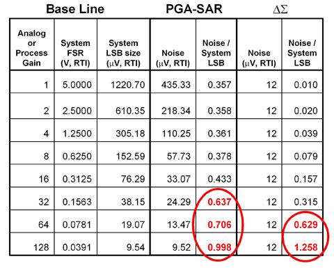PGA-SAR 系统无法使用 16V/V 以上的 PGA 增益达到 12 比特级别的可重复性(参见表 1)。那么,Δ-Σ 系统会怎么样呢?