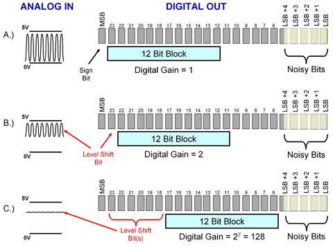 如果我们从输入的角度来研究 Δ-Σ 系统,我们便能理解系统较低有效位 (LSB) 的大小。过程增益为 1 时,RTI 系统 LSB 大小等于 1.22 mV,且噪声级别为 12 mVrms。随着过程增益的增加,系统LSB大小下降,同时参考输入 (RTI) 噪声保持恒定。例如,过程增益为 128 时,理论 RTI LSB 系统大小为 9.54mV,而 Δ-Σ 转换器的噪声级别仍然为 12mVrms。