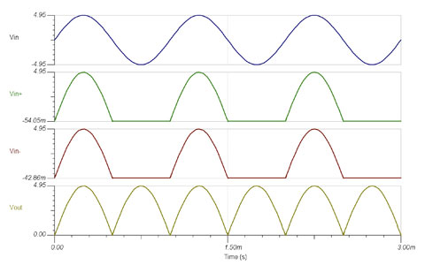 就正信号 (Vin > 0V) 而言,U1 起到一个加法器放大器的作用,而 U2 和 U1 则不相干。就负信号 (Vin <0V) 而言,D1 和 U2 形成一个接地钳位,将 U1 的非反相输入保持在 0V。现在,U1 仅起到一个反相放大器的作用。结果是 VOUT 时的全波整流正弦波,如图 2 所示。