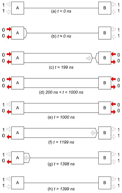 通过研究某个具有实际延迟值的假设案例,我们可以更加具体地介绍这些计时要求。在我们的二节点例子中,设定总单向延迟为 200ns,信号传输速率为 1Mbps,也就是 ISO 11898-2 标准规定的较大值。这样,位时间便为 1000ns。除节点 B 的第二位会是同节点 A 的消息优先级匹配的 0(非占用)以外,其同情况 2 所述一样。(情况 2 中,节点 B 具有一个占用第二位,表明更高的消息优先级。)