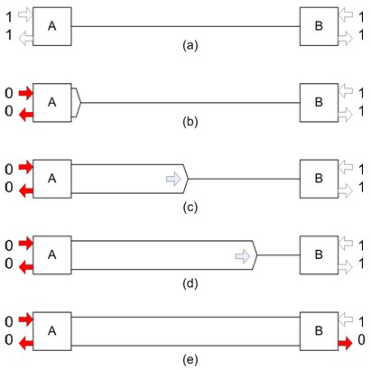我们的下一种情况(图 2)假设,节点 A 再次发起一条消息,但是节点 B 在稍后发起的一条消息具有更高的优先级。如前所述,这种情况以两个节点均处在非占用模式作为开始,如 (2a 所示,随后节点 A 变为占用(如(2b)所示)发起一条消息。该占用差动电压再次沿线缆传输。在信号到达 B 处的收发器以前,该节点刚好利用如(2c)所示占用位发起一条消息。这时,两个节点都正传输一个占用位,并且两个节点都正接收一个占用位(如(2d)所示),然后两个节点都没意识到另一个节点也已启用。由于在我们的假设情况中,节点 A 具有比节点 B 更低的优先级,因此有时节点 A 会通过将其 TXD 设置为 0(如(2e)所示)来发出一个非占用位。但是,由于节点 B 的作用,RXD 会感应到总线仍然处在占用状态下。