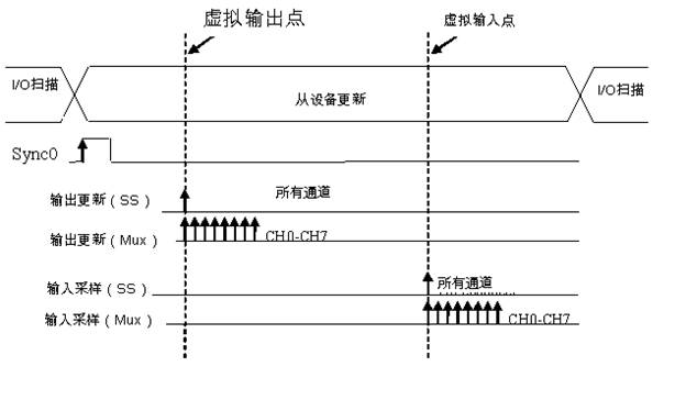 主控制器还使用Sync0对齐“虚拟点”,这是所有从机箱对各自的I/O进行更新的精确时间点。由于NI扫描引擎作用于单点数据,虚拟输出点已经经过优化以便较快地获取输出模块的更新,虚拟输入点已经过优化以提供输入模块的较新采样。在这种模式下,在个别通道之间的更新只会出现很小的抖动,这对于控制应用而言是十分理想的。对于含有多路复用I/O的模块而言,输入在每个周期中都会包含一定的延迟,因此通道0读数相对于下一个通道0读数而言,会有相同的偏差值。此外,同步采样模块对于所有使用的相同模块都在准确的相同时间进行I/O通道更新,即使使用不同的模块,也可达到较小的相位偏移。假设在从设备更新中,每个从设备采样发生在两个相同的虚拟点上,那么对于所有网络上的NI 9144从设备的输出和输入都会有同步的开始时间。