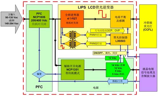 图2:安森美半导体针对32英寸液晶电视的全桥高压LIPS解决方案功能框图。