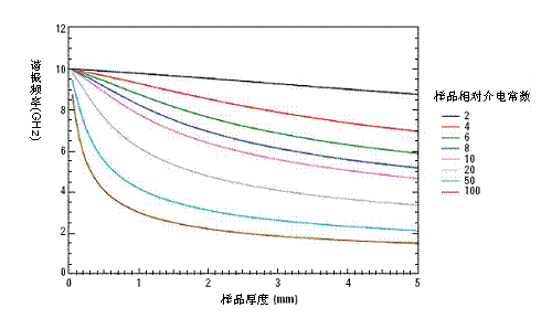 当把样品放置在两个半圆柱体腔体之间时,圆柱体腔体的谐振频率会发生偏移,并且往往是比空腔体时的谐振频率低。谐振频率的偏移程度取决于相对介电常数的实部和样品的厚度,通过改变样品的厚度,可以得到特定的测量频率,当然也有可能频率偏移至一定程度后,受到其他非TE模式的干扰信号,造成测量精度降低,这时候只能通过再次增加或减少样品的厚度来减少其他干扰模式。图1列出了样品谐振频率、相对介电常数和样品厚度之间的关系。