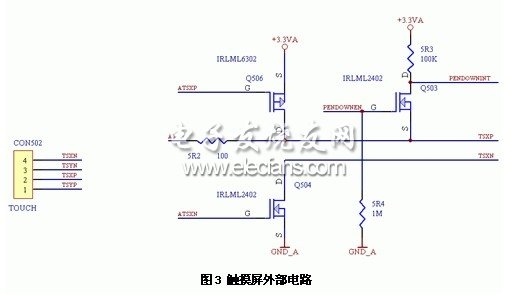 不同的应用领域触摸屏的设计方式也各不相同,一般有以下三种:⑴应用触摸屏模块。触摸屏模块提供标准的硬件接口与应用系统(一般为PC或X86架构的工控机)相连,安装驱动程序后即可工作,基本无需开发;⑵扩展触摸屏控制器。这是嵌入式系统中设计触摸屏普遍使用的方法,常用的触摸屏控制芯片有ADS7843、ADS7846等,这些芯片内部集成了A/D转换器和触摸屏的驱动电路,同时要设计一定的软件;⑶与前面方式⑵相仿,有些处理器集成了A/D转换器,通过IO口模拟触摸屏的驱动信号也可实现触摸屏的控制。