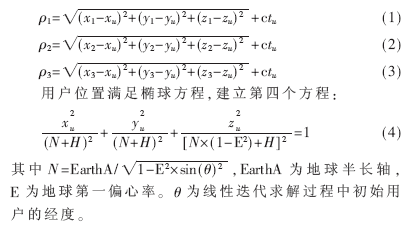 北斗一号星座包括两颗同步卫星、一颗备份星,分别位于东经80°、东经140°和东经110.5°。同GPS定位方式一样,如果同时利用天上的三颗卫星同用户之间的距离可以联立三个方程,但是如果需要同时求解用户的三维位置及用户钟和北斗时之间的时钟差的话,必须再建立一个方程。用户的坐标满足椭球方程,因此可以通过气压测高的方式得到用户的海拔高度来建立第四个方程,由于联立的四个方程是非线性的,可以通过迭代的方式求解。