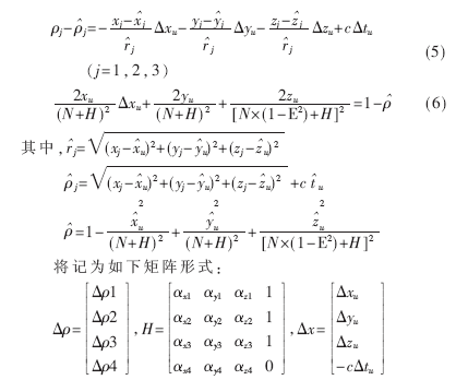 )之间的偏离用位移(Δxu,Δyu,Δzu)来标记。将式(1)~(4)按泰勒级数绕近似位置展开,则可以将位置偏移(Δxu,Δyu,Δzu)表示为已知坐标点和伪距测量值的线性函数。这个过程如下: