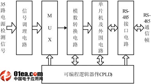 电源故障检测电路由硬件和软件两大部分组成,硬件组成框图如图1所示。信号调理电路对输入的35路电源检测信号进行滤波、分压及阻抗匹配,然后经过多路复用器(MUX)选择进入模数变换器(A/D),变换成数字量,单片机读入该数字量,与规定的上下限进行比较,判断该电压是否正确,较后生成单元级故障表,通过RS-485接口传送到上级进行进一步处理。
