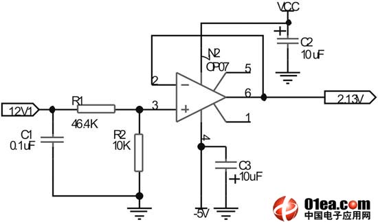 信号调理电路主要对输入的电源检测信号进行滤波、分压及阻抗匹配等处理。滤波的目的是滤除检测信号中的高频毛刺,通过试验可以看到,天线电源信号中常有幅度很大的干扰毛刺,如果不滤除可能会对器件造成损坏,或者影响检测精度。分压的目的是对检测信号的幅度变换,使其满足后级A/D变换器的输入要求,设计的关键是既保证信号的幅度不超出A/D的输入要求,又要尽量提高信号的分辨率。阻抗匹配电路是一个射极跟随器,目的是进行前后的阻抗匹配,提高检测的精度。图2是12V检测电压的调理电路。