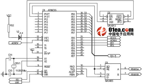图5是单片机及外围电路,单片机选用ATMEL公司的AT89C55,内部带有20K字节的程序存储器,是整个故障检测电路的控制核心,它通过运行程序控制检测电路进行电压检测,将检测的结果进行初步处理,产生单元级故障表,送上级进行综合处理。集成电路D2(MAX813)是看门狗,主要功能是监视单片机程序的运行状态,如果程序跑飞超过1.6秒,看门狗就产生一个复位信号,对单片机进行复位,使程序重新进入正常步骤。集成电路D3(MAX485)是RS-485串行通信接口,它实现TTL电平与RS-485电平的相互转换,是检测电路与上级单元的通信接口。二极管V2是故障指示灯,当检测到电源故障时,点亮指示灯。