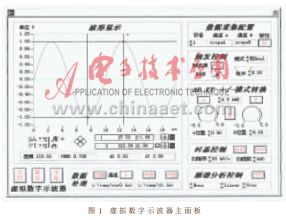 本虚拟数字示波器主要由一块PCI总线的多功能数据采集卡和相应的软件组成。将它们安装在一台运行Windows95/98/NT的PC机上(建议配置在PENTIUM Ⅱ/233以上),即构成一个功能强大的可存储数字示波器。该数字示波器操作与显示主面板如图1所示。