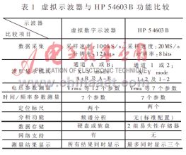 由表1可以看出,除了由于经费原因使得所选数据采集卡采样速率低于HP54603B外,本虚拟示波器在显示、测量、分析、存储和外部连接等方面的功能都不低于甚至高于HP 54603B。