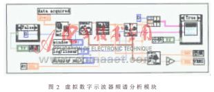 LabVIEW编程的主要特点就是将虚拟仪器分解为若干基本的功能模块(相当于硬件设计中的集成电路),模块的引脚代表输入/输出接口。编程者可以通过交互式手段,采用图形化框图设计的方法,完成虚拟仪器的逻辑和测量分析功能设计。图2是虚拟数字示波器频谱分析模块程序。
