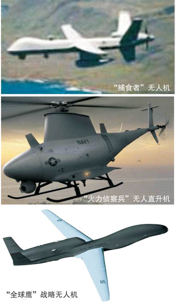 无人机,从广义上说包括所有的运输模式、武装飞机乃至水下工具、未爆弹处理机器人等。通常所说的无人机,是指狭义上的无人驾驶飞机(Unmanned Aerial Vehicles,UAV),本文主要讨论后者。无人机在军事武库中发展活跃,目前约占国防相关军事航空活动的80%。与传统的有人驾驶飞机相比,无人机具有无可替代的优势:能够在受到极度威胁的地区执行任务、行程更远、持续能力更强并且由于无飞行员支持系统、机身减小,无人机制造和部署的成本大大降低。军用无人机主要功能是侦察、监视与目标捕捉,其次是干扰和攻击。著名无人机有“全球鹰”、“捕食者”、“火力侦察兵”、X-45和X-47; “阴影”、“搜索鹰”等(见图1)。
