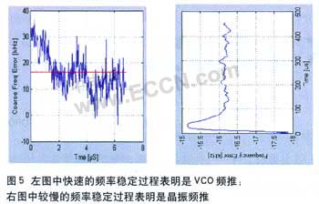 例如,当功率放大器上电的时候就可能会出现问题,功率放大器产生的电流将对晶振或者本地振荡器产生频率牵引。典型情况下,如果频率恢复得快,那么很有可能是本地振荡器受到牵引,但是当其恢复较慢的时候,则可能是基准晶振受到牵引。这里以实例说明图形化界面是如何帮助我们判断受到牵引的是晶振还是LO的(如图5所示)。