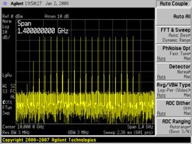 图 2 是对图 1 中所示的同一线性调频雷达的测量,这次使用的是 Agilent PSA 频谱分析仪的 FFT 模式,并采用不同的 RBW 设置。RBW 的默认值为 3 MHz时,我们只能偶尔捕捉到频谱。通过将 RBW 降低至 1 kHz,我们才能对频谱进行测量。但是,与图 1 所示的扫描模式下 100 ms 的扫描时间相比,现在,测量所需时间是 91s。另外,降低 RBW 还会降低脉冲灵敏度,从而导致较低的动态范围。将两图进行比较可知,本例中的扫描模式可达到 15 dB 以上的动态范围。有关脉冲灵敏度降低的解释,可参阅安捷伦雷达测量应用指南。[2]
