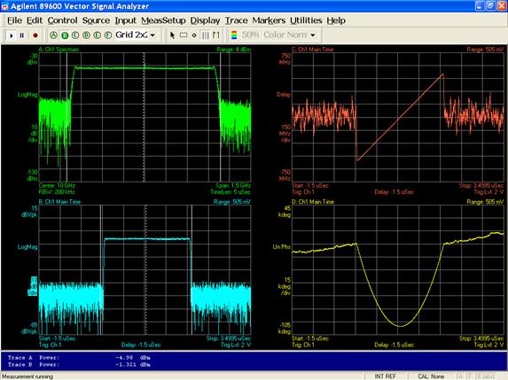 例如,由于矢量信号分析仪可以测量随时间和频率变化的信号的幅度和相位,因而可进行调制分析。图 3 显示的是使用连接至 Agilent PSA 频谱分析仪的 Agilent 89601A VSA 软件同时测得的雷达线性调频随时间变化的幅度、相位和频率响应。