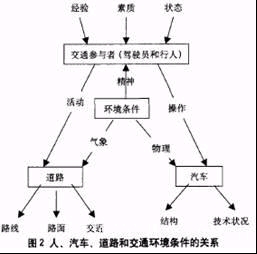 汽车道路交通事故是世界性的灾害,因此汽车交通安全也是世界性的难题。道路交通事故引起人的伤亡,财产的损失,给国民经济也带来了巨大的损失。然而诱发交通事故的因素是多方面的,它受汽车行车速度、道路条件、车辆状况、驾驶员行为、驾驶员的文化素质和自然环境等因素的综合影响。其中人、汽车、道路、环境条件是影响道路交通安全的主要因素,它们之间的关系见图2。