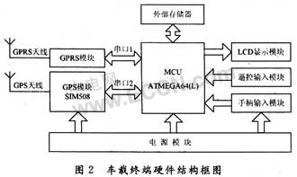车载终端硬件系统以单片机和 GPS+GPRS 模块为核心,属于经济型功能终端,其结构如图 2 所示。