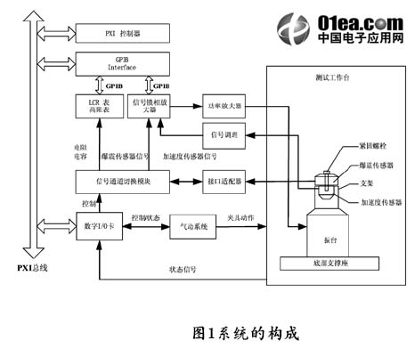采用PXI高性能的硬件平台作为汽车爆震传感器测试系统的控制核心,使整个系统的可靠性、高效性和可扩展性都大大提高。PXI系统的组成如图1所示,主要包括PXI控制器、PXI数字I/O板卡、振台、LCR表、高阻表、信号锁相放大器、信号通道切换模块、气动夹具系统等。