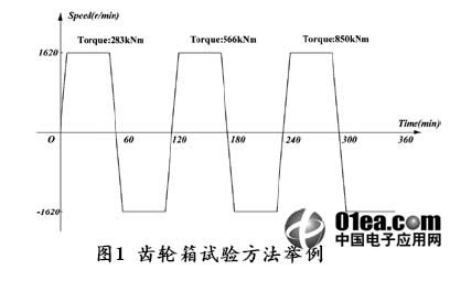 风电测控系统将两个齿轮箱产品放置在步进电机主轴的两侧同时进行检测,依靠步进电机的带动模拟齿轮箱实际工作状况。按照图1所示,分为三个阶段驱动电机运行,第一个阶段给齿轮箱加载283kNm的负载,电机首先以1620r/min的转速正转60分钟,然后再以同样的速度反转60分钟,如此重复三次,每次加载不同的负载,第二三阶段的负载分别为566kNm、850kNm。电机稳定运行状态下,检测环境参数及振动噪声相关指标,评定齿轮箱产品质量。