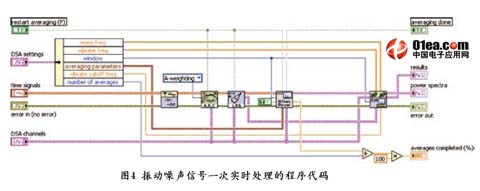 齿轮箱测试试验标准要求试验过程中每隔15分钟进行一次振动噪声信号采集和实时频域傅立叶分析,关心的频率分辨率为0.5Hz,带宽为20kHz,16次谱平均,对于振动信号需要进行频带能量计算,噪声信号需要进行等效声压级计算。这就要求我们每次计算对时域振动噪声信号以80kS/s采样率采集2秒,连续进行16次采集及计算。一次实时处理的程序代码如图4所示。
