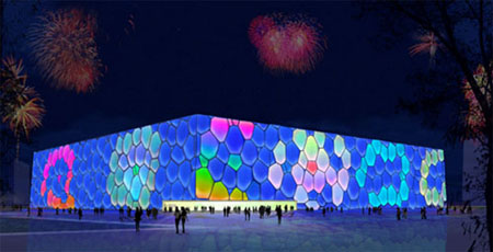 国家游泳中心“水立方”总建筑面积六万五千至八万平方米,与中轴线另一侧的国家体育场遥相呼应、相得益彰,以和谐的面貌把主场区的气氛推向高潮。其功能完全满足二00八年奥运会游泳、跳水、花样游泳、水球等赛事要求,可容纳座席一万七千个,且易于赛后运营。赛后它将成为北京较大的、具有国际先进水平的多功能游泳、运动、健身、休闲中心,成为奥林匹克运动留给北京的宝贵遗产和北京城市建设新亮点。
