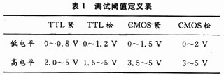 为了满足TTL和CMOS电路的测试阈值要求。阈值是对测试时高电平和低电平的规定,分为“紧”和“松”两类。紧阈值是器件严格测试时遵循的标准,松阈值是对器件测试要求不高时遵循的标准。如表1所示。