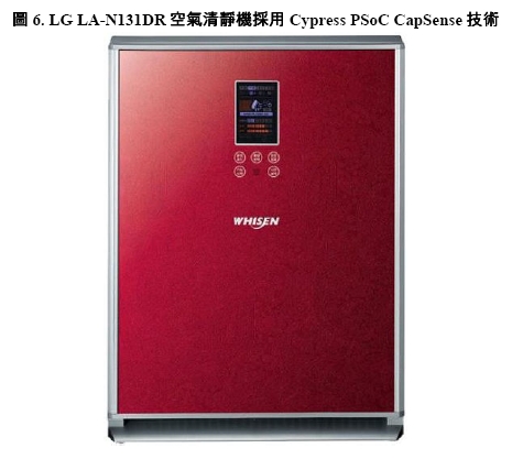 LG LA-N131DR 空气清静机在面板显示器选单浏览的按键上中用了五个电容传感器。这些按键让设计人员可以设计出平顺的机身,同时也具备使用者接口。电容式按键透过四毫米的玻璃侦测有无手指触碰。