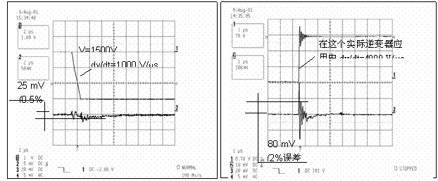 开关设备每次开关时产生的高dv/dt值将在初级电缆和传感器电路之间产生电容电流。大多数模拟线性放大器对这种寄生电流很灵敏。因此,dv/dt噪声将被叠加在输出信号上。根据变动电压的幅度和斜坡,初始尖峰和后来的振荡有时会非常高,以致它们会激活传感器的电流保护电路,进而使逆变器暂停运行。LEM的经验在HX系列设计阶段帮助保证了对关键噪声水平的完美免疫力,而又不会损失带宽,因此HX的性能要超过其他类似的传感器(图2和图3)。
