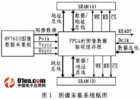 图l为图像采集系统框图。该系统包括OV7620图像数据采集板、FPGA的图像数据接收缓存板、两片SRAM构成的高速缓存以及系统外部接口。OV7620图像数据采集板主要完成图像数据采集,其图像数据总线、帧图像数据时钟、帧同步信号、行同步信号与FPGA图像数据接收缓存板相连,FPGA协调两片SRAM“乒乓模式”的读写操作,并完成模块的外部接口。