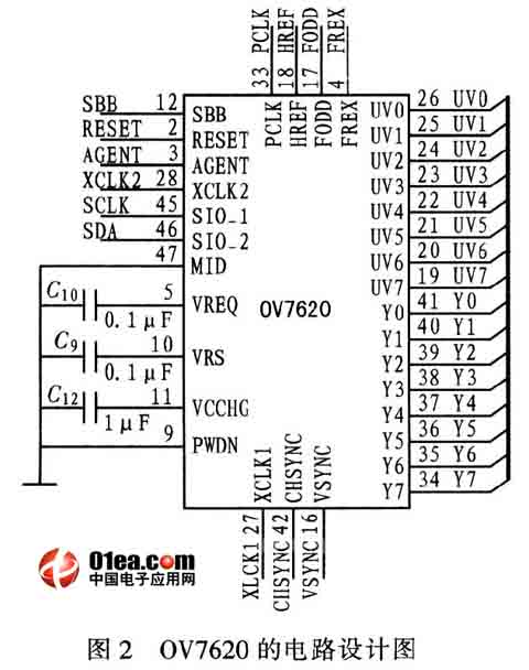 该系统设计采用OV7620的电路如图2所示。其中,SBB引脚接跳线,用于设置OV7620在复位时读取引脚状态或I2C方式配置;UV2引脚接上拉电阻鬼知道版权所有,选择0V7620为QVGA工作状态(320x240);Y3引脚接上拉电阻,选择OV7620为RGB数据格式输出:Y1引脚接上拉电阻,选择OV7620位逐行扫描模式;PWDN引脚接地,OV7620不能工作在睡眠模式;UV0~UV7,Y0~Y7,XCLKl,HSYNC,VSYNC,PCLK,HREF工业自动化网版权所有,FODD,FREX接26针的插座,与FPGA相连,由FPGA输出时钟和控制信号控制0V7620。在PCB设计时,应将模拟电源和数字电源、模拟地和数字地分开。电源的输入引脚接O.1μF的去耦电容和47μF的防止电源“浪涌”的电容。模拟地和数字地分开布线鬼知道版权所有,较后在一点接地。晶体振荡器应尽可能靠近器件放置,使其起振效果达到较佳。