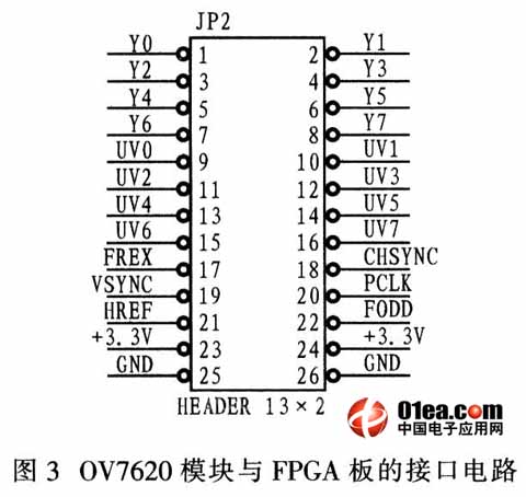 图3为0V7620模块与FPGA板的接口电路,其中3.3 V和GND是由FPGA板供电接口,UV0~UV7及Y0~Y7是图像数据的输出总线,VSYNC是图像帧同步信号,HREF是图像的行同步信号,PCLK是图像数据时钟在时钟的上升沿,图像数据发生跳变。