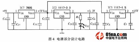 图4为电源部分的设计电路。其中,FPGA板接9 V直流电源的输入,经7805后北京汉阳,9 V的电压转换为5 V,经电容平滑滤波后,5 V的电压输人给1117—3.3,得到3.3 V电压。电源工作指示灯VD2指示电源是否正常工作。同时,5 V的电压经1117—1.5,转换为1.5 V的电压输出供给FPGA使用。